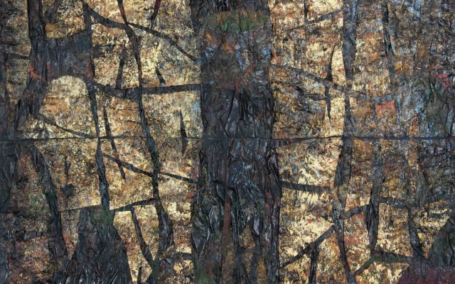 « Des étendues de papier où la couleur se dépose en fine pellicule…Papier patiemment froissé et plissé. Ainsi se dévoile un espace savamment chaotique que la couleur construit, le pli structure et la lumière révèle. Débute alors un dialogue entre le frémissement de la matière et l’imaginaire…